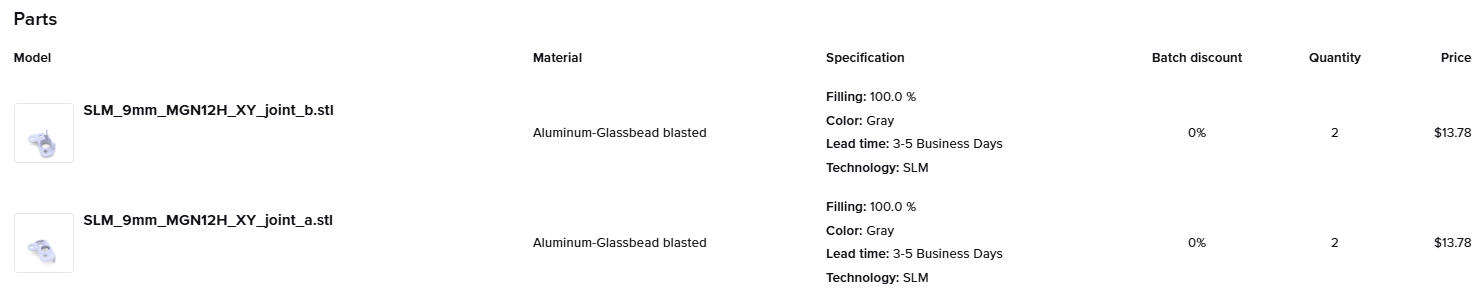 I finally managed to order the SLM XY joints today. Based on what I'm seeing, there will be no or just minimal weight penalty compared to MGN9H + sheet metal XY or MGN9H + milled XY.